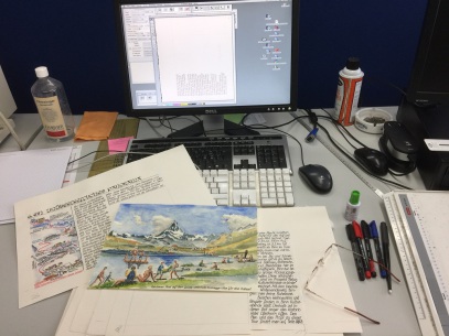 Das war mein Arbeitsplatz in den letzten drei Wochen in der Druckerei, wo Bilder und Text den letzten Schliff erhielten und ich alle 130 Seiten und Bilder einscannte
